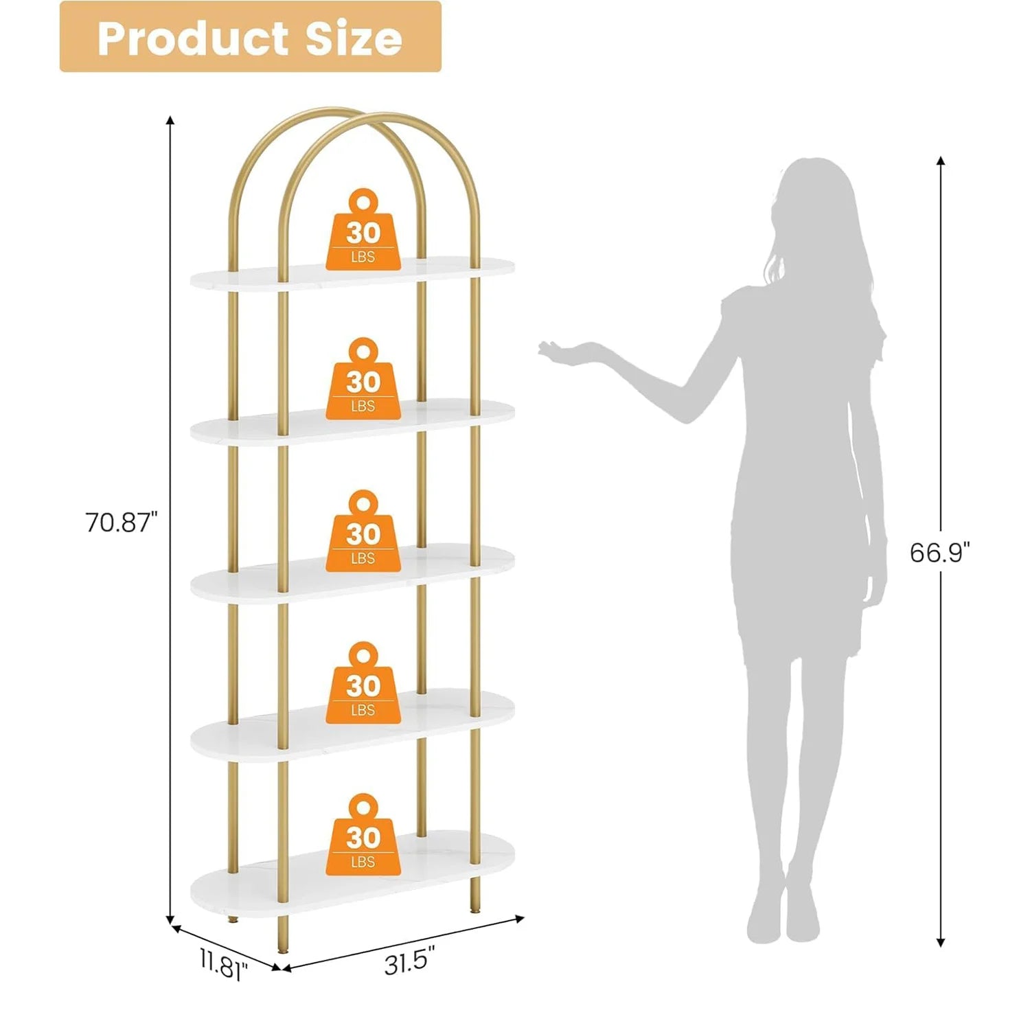 This striking 5-tier bookcase combines architectural elegance with practical storage. The distinctive arched design creates visual interest whilst maximising display space across five generous shelves. Ideal for showcasing collections, books, or decorative pieces, each tier offers sturdy support for varied weights and sizes. The curved framework adds contemporary sophistication to any room, whether used as a focal point in a living space or a functional storage solution in a study. Perfect for those seeking both form and function in their home furnishings.