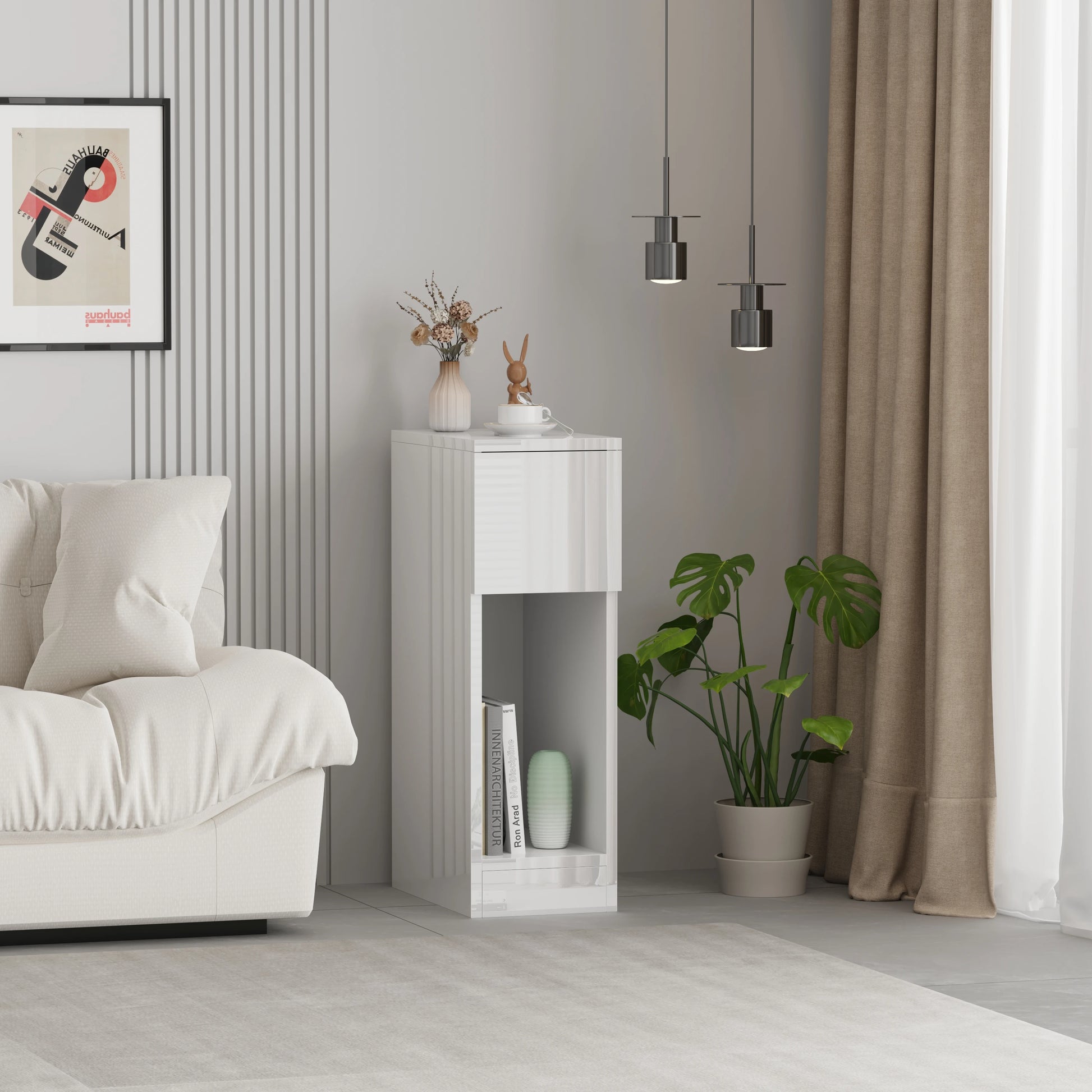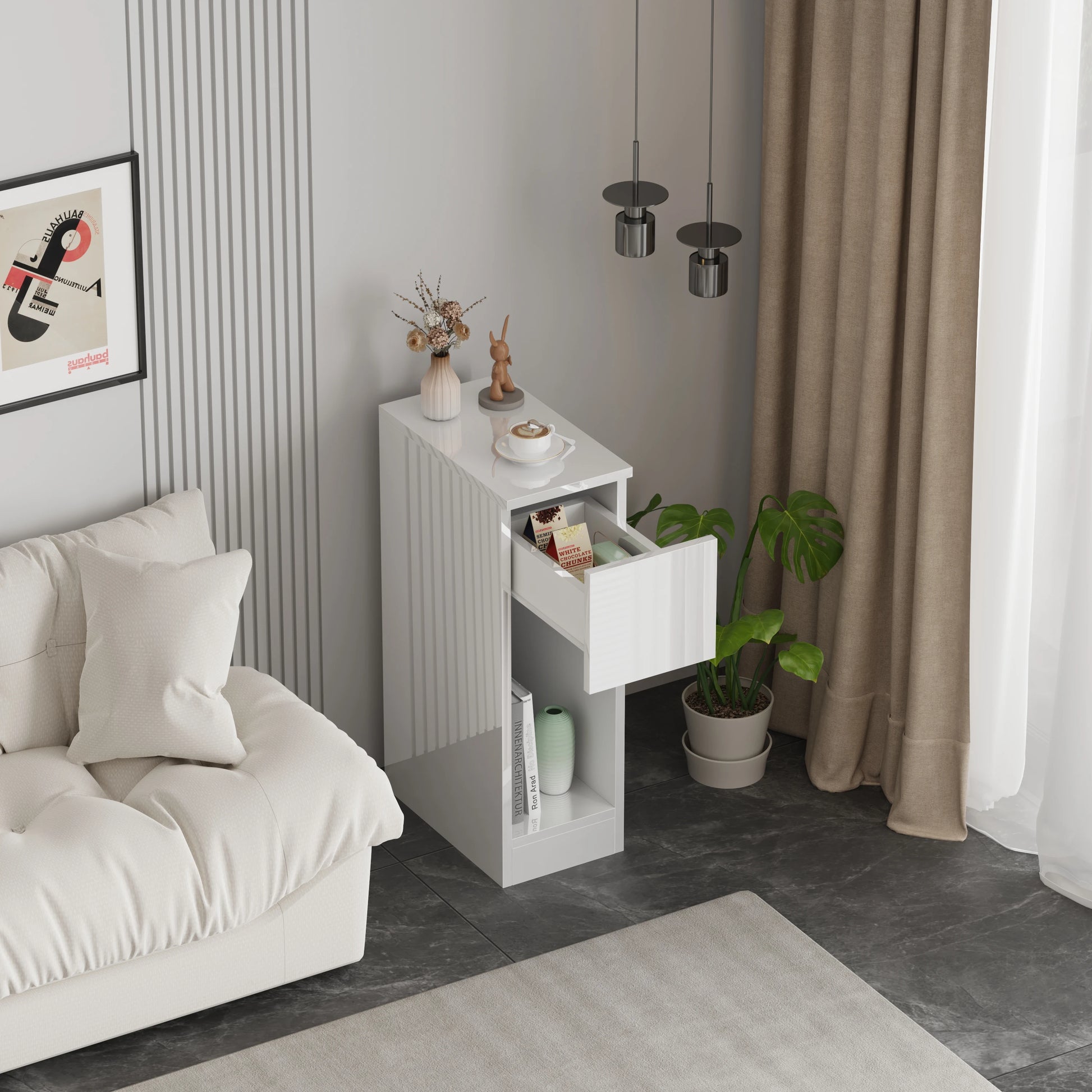 This Slim Bedside Table offers a minimalist design ideal for small spaces, combining sleek aesthetics with practical storage. Its slender profile allows it to fit comfortably beside any bed without overwhelming the room. Built with durable materials, it provides a stable surface for essentials like lamps, books, or personal items, enhancing organization and accessibility in your bedroom.